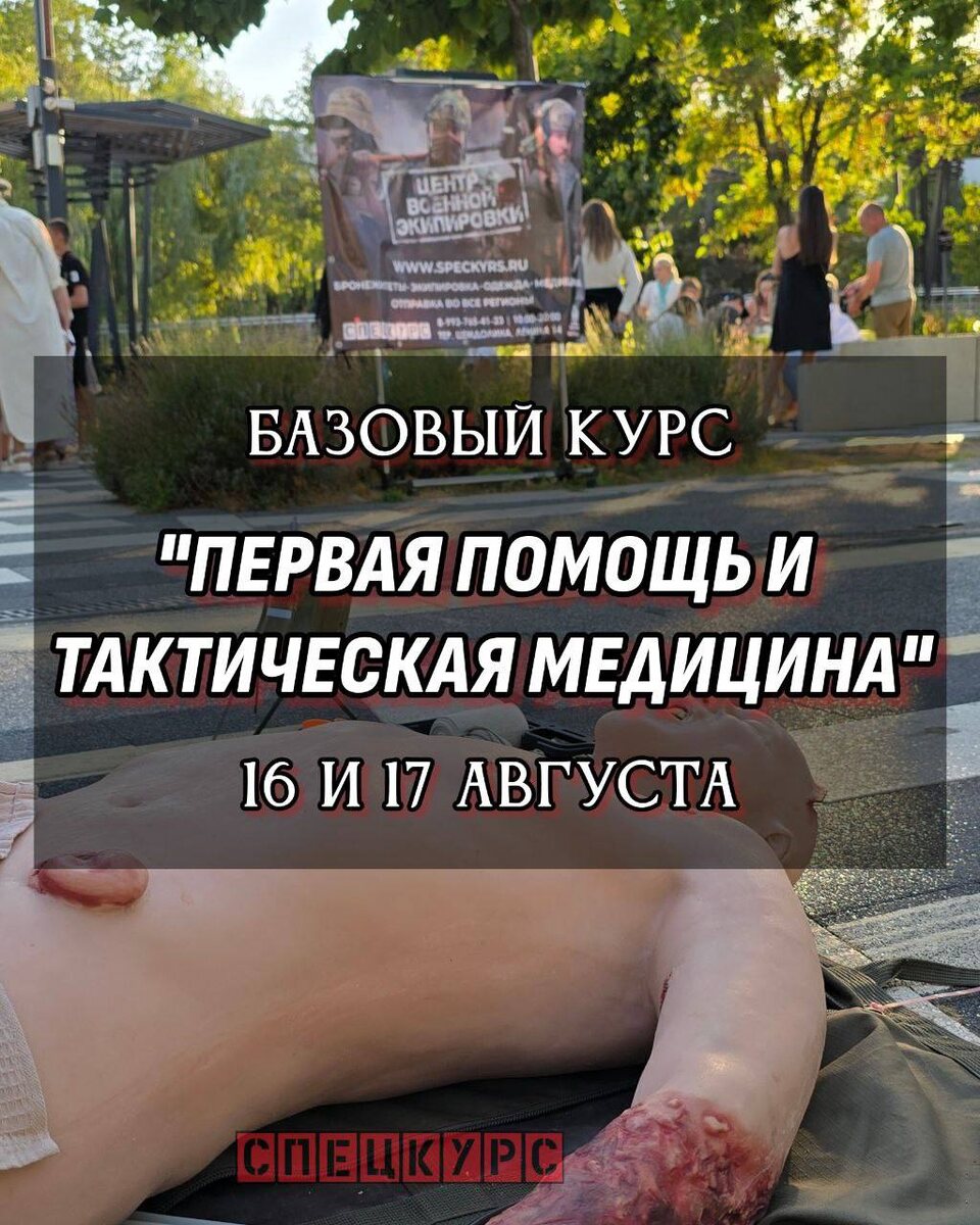 16 и 17 августа базовый курс "Оказание первой помощи и Тактическая медицина" В курс входит: - Законность оказания первой помощи; - Остановка кровотечений (наложение жгута); - Сердечно-легочная реанимация; - Наложение повязок; - Аптечка и её наполнение; - Помощь при различных травмах, иммобилизация; - Перемещение пострадавших. Суббота - занятие в аудитории с 14 до 18 часов, воскресенье - занятие на полигоне с имитацией экстремальных условий с 11 до 16 часов. За два дня вы узнаете что можно делать при оказании помощи, а что нельзя категорически. Возраст участников- от 12 лет и старше. Для записи на занятия звоните +7-928-208-96-92 или @SpecKyrsAdmin Не упустите шанс научиться важным навыкам, которые могут спасти жизнь!