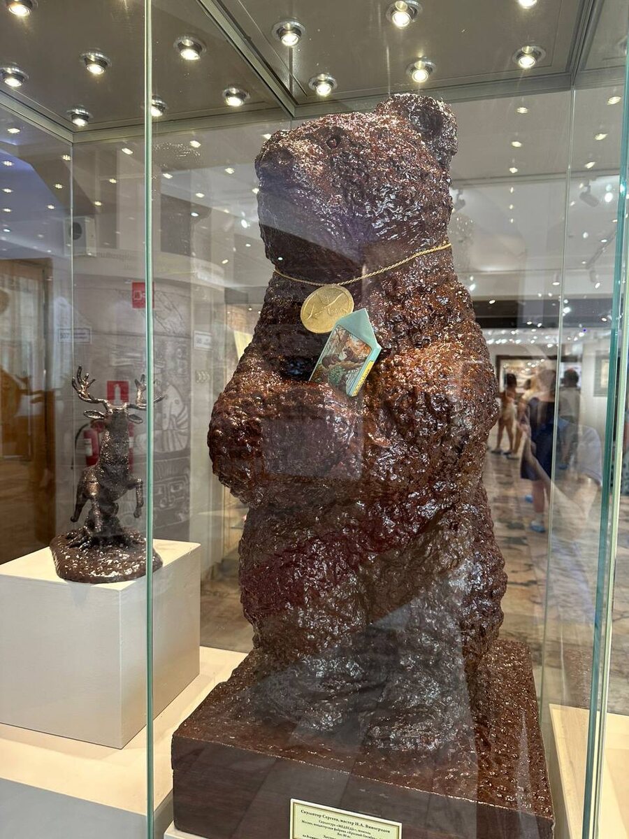 В 1958 году на Всемирной выставке в Брюсселе фабрика «Красный Октябрь» не только представила свои знаменитые конфеты «Мишка косолапый» — она представила целую шоколадную скульптуру, созданную в честь этого символа. Скульптура, выполненная из чистого шоколада, стала центральным экспонатом и произведением искусства: она весила около 80 кг. Благодаря этому, фабрика получила Высшую награду выставки - Гран-при!