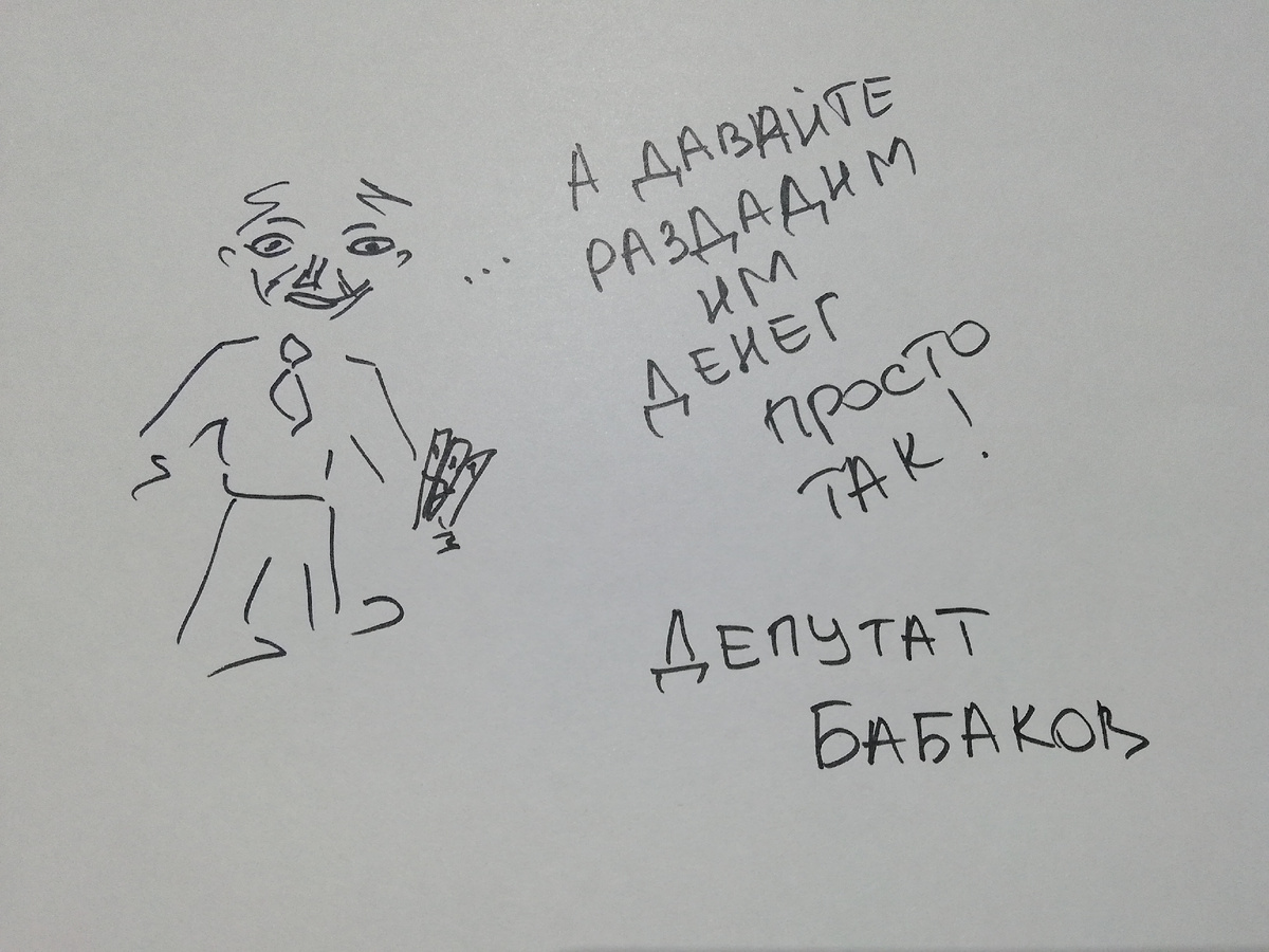 В Госдуме предложили платить россиянам базовый доход. Всем. Просто так. За то, что мы такие хорошие россияне. Это моя любимая Госдума. Депутат Александр Бабаков желает всем россиянам повышения качества жизни. И вообще. Может себе позволить. Таких чудес ещё не бывало. Представляю, как на него глянули все остальные. Может, он им ещё скинуться предложил? Хороший, великодушный человек. Перестаньте его бить! Эх, неплохо бы. Но вряд ли. А то цены на бензин бъют рекорды. Опять пробили исторический максимум. А их и остальное догоняет. Но есть и хорошая новость. Путин на совещании по экономическим вопросам сказал. Инфляция к концу июля снизилась до 8,8%. А будет ещё ниже! Ситуация с федеральным бюджетом устойчивая. Банк России всё контролирует. Безработица низкая. Всё зашибись! А вот из Росстата и Минэкономики говорят, "что спрос домохозяйств охлождается в силу его насыщения непродовольственными товарами и снижения доступности кредитов". Вот умеют красиво. Короче, денег хватает