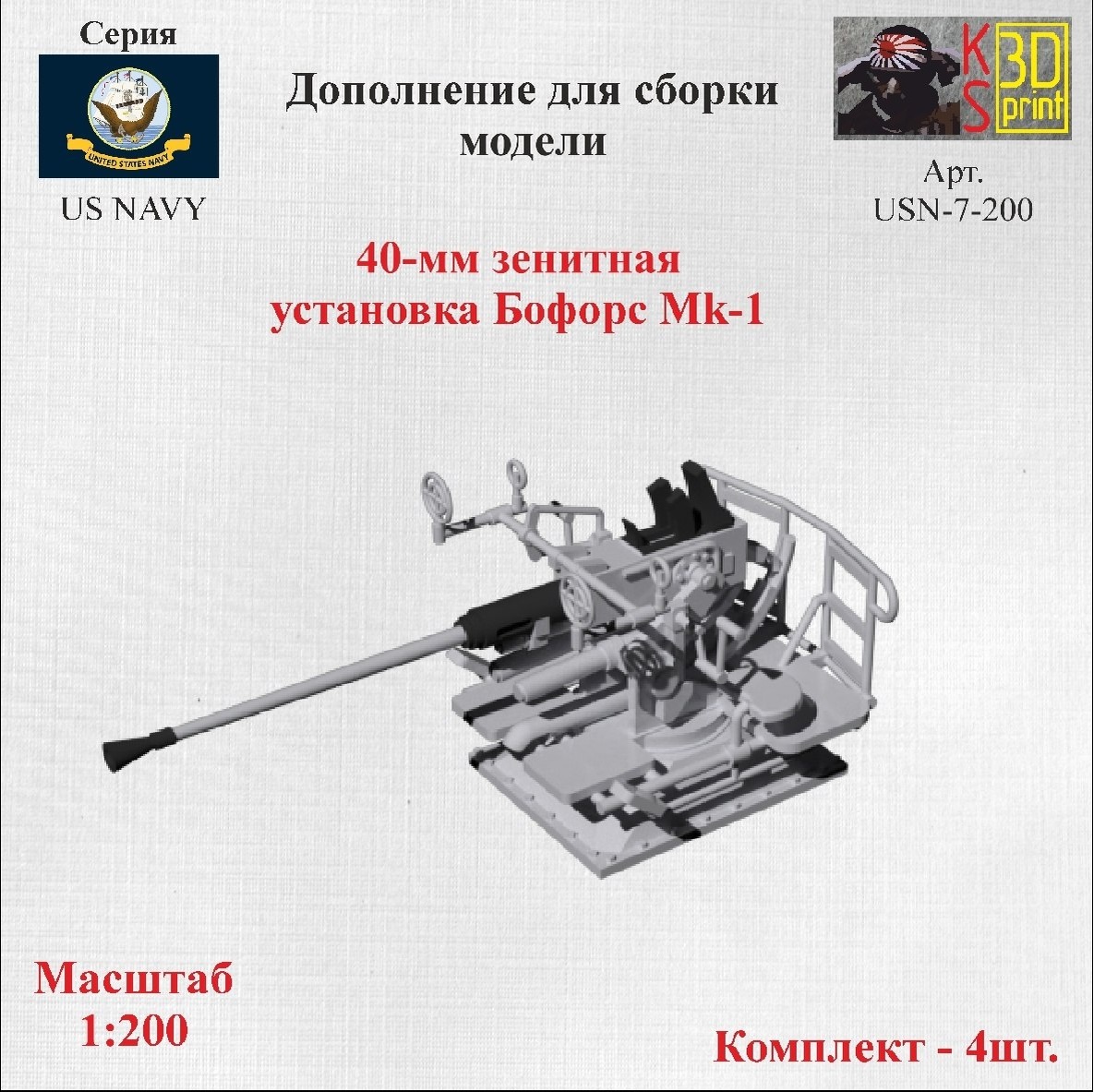 Московская "Картонный самурай" выпустила на 3D-принтере модель американской корабельной 40-мм зенитной пушки "Бофорс" Мк.1 в масштабе 1/200 (4 шт. в наборе).