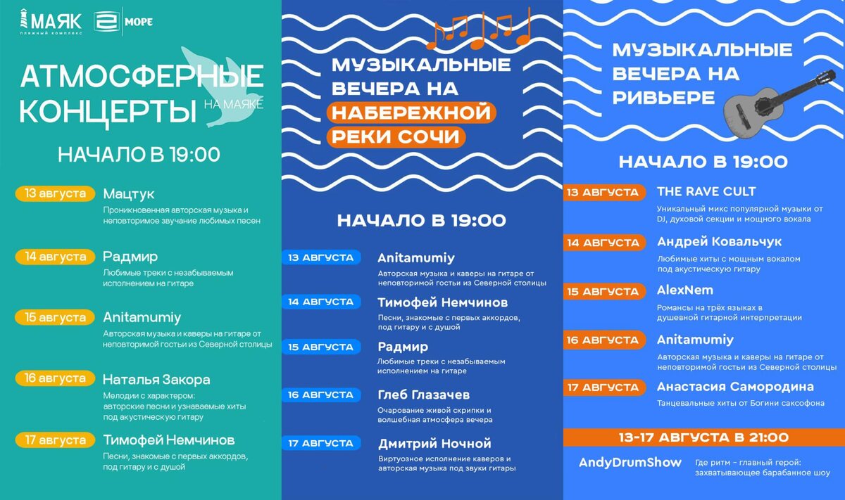 Расписание концертов на пляжах Маяк, Ривьера и набережной реки Сочи