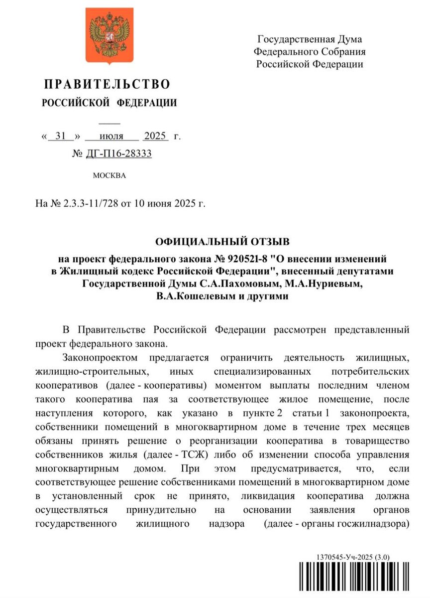 Коллеги, вот мы и видим следующих реальные признаки того, что наша деятельность была не зря. После огласки, обсуждений, встреч и наших писем законопроекту №920521-8 всё-таки не дают в легкую. Ранее - Правовое управление ГосДумы дало негативный отзыв на законопроект. А теперь… Аппарат Правительства РФ не поддерживает законопроект №920521-8. Замечу, что руководитель Аппарата Правительства Д. Григоренко отдельно указал на: В пояснительной записке отсутствует информация о неэффективности деятельности кооперативов после завершения строительства многоквартирного дома Возложение на органы госжилнадзора новых полномочий потребует выделения дополнительных ассигнований из бюджета бюджетной системы Российской Федерации А законопроекты нередко увеличивают бюджетные расходы, но на это редко обращают внимание. Согласитесь, пару месяцев казалось, что нас никто не услышит. Так что важно понимать: наши подписи, письма, обсуждения и внимание к теме уже повлияли на ситуацию. Мы создали вокруг за