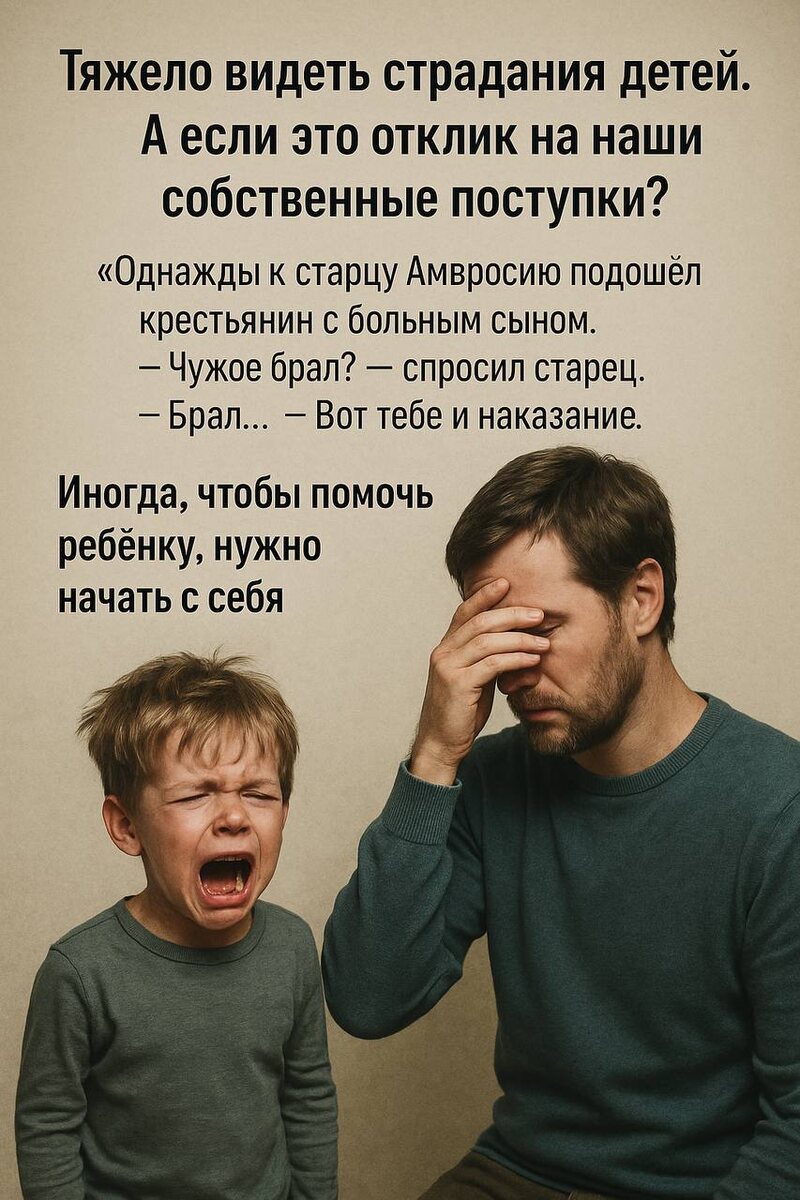Тяжело видеть страдания детей. Но задавали ли мы себе вопрос: а не мы ли — источник их боли? «Однажды к старцу Амвросию подошел крестьянин, на руках у которого бился бесноватый мальчик, и попросил об исцелении. — Чужое брал? — строго спросил старец. — Брал, грешил, батюшка. — Вот тебе и наказание, — ответил старец и отошел». Этот рассказ — не приговор, а сигнал задуматься. Он учит: хотим счастливых детей — начнём с себя. Честность, уважение, умение прощать и просить прощения — всё это формирует атмосферу, в которой растёт ребёнок. Ваши перемены — их защита. Ваши ценности — их сила. А у вас есть такой опыт, что за плохие поступки родителей приходится отвечать детям?
