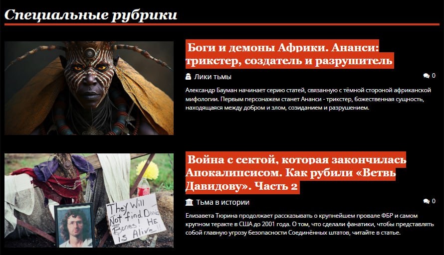 #анонс В спецрубриках августовского номера вас ждёт: – «Боги и демоны Африки. Ананси: трикстер, создатель и разрушитель» – Александр Бауман начинает цикл статей о тёмной стороне африканской мифологии. – «Война с сектой, которая закончилась Апокалипсисом. Как рубили "Ветвь Давидову". Часть 2» – Елизавета Тюрина продолжает рассказывать о секте «Ветвь Давидова». Новый номер выходит традиционно в ночь с 19 на 20 число. Ждите! И, кстати, напомним, что наши спонсоры на Бусти могут все это и многое другое прочитать уже сейчас: boosty.to/darker