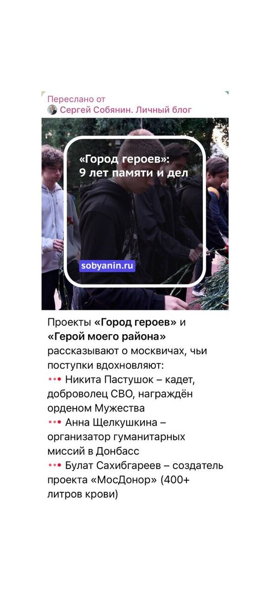 Сохранить и передать новому поколению память о подвигах героев Отечества, укрепить связь времен и поколений. Поддержать молодых людей, которые стремятся реализовать собственные патриотические проекты. В этих целях в 2016 г. был создан проект «Город героев». На сегодня в его активе более 750 мероприятий, которые объединили более 10 000 москвичей. Благодарим проект «Город Героев» , что поддержали Анну Щелкушкину🇷🇺 https://t.me/blogsobyanin/2501 https://www.mos.ru/mayor/themes/13222050/ ДГП «Русский Донбасс»🇷🇺