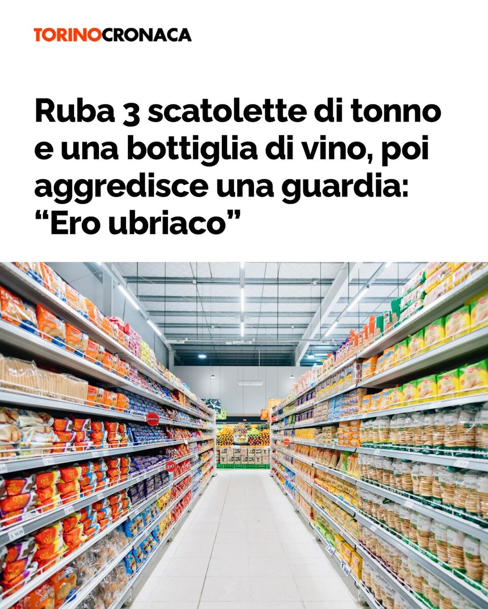 ❤️ НОВОСТИ ТУРИНА ✅ СПРАВКА: Эта новость переведена и размещена при помощи искусственного интеллекта Chat GPT без участия человека, в случае если вы заметили ошибку, или новость не соответствует реальному событию — сигнализируйте, исправим. 👉 Искренне Ваш Сержио Боттичелли: https://www.facebook.com/mercator.cz __________________ «Я сделал это, потому что был пьян». Так, сегодня утром, 12 августа 2025 года, 29-летний мужчина предстал перед судьей суда в Турине, признавшись в попытке украсть три банки тунца и бутылку вина в супермаркете в Грульяско два дня назад. Охранник магазина заметил его и подошел, чтобы остановить. По версии обвинения, молодой человек отреагировал, подняв костыль, который держал в руке, и произнеся угрозы. «Я никому не угрожал, — ответил обвиняемый в зале суда, — это охранник меня оскорбил». Немедленное вмешательство правоохранительных органов привело к его аресту и переводу в тюрьму по обвинению в грабеже. Это не первый раз, когда 29-летний мужчина оказывае