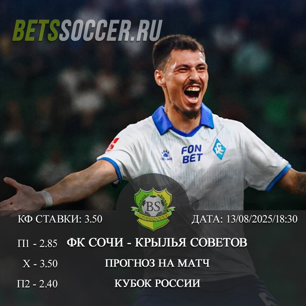 ⚽️ Сочи – Крылья Советов: прогноз на Кубок России, Путь РПЛ, Группа «В». 2-й тур (13/08/2025/18:30) 💬 Крылья Советов эффектно и эффективно играют в гостях, используя контратаки. Так были повержены игравшие первым номером и шедшие в атаку Краснодар (2:1) и Ростов (4:1). Однако Сочи – коллектив не столь мастеровитый и не стремящийся идти вперёд всеми силами, а потому лучшие качества самарцев будут нейтрализованы. Без них «крылышки» выиграть не смогут, но и не проиграют. 🎯 ПРОГНОЗ НА МАТЧ: НИЧЬЯ (кф 3.50) 👉 ПОДРОБНЫЙ ПРОГНОЗ ❗️ ЗАБИРАЙ ФРИБЕТЫ 🎁 БК WINLINE 3000₽ (промокод: BETWIN) 🎁 БК МЕЛБЕТ 25000₽ (промокод: BS888) 🎁 БК PARI 5000₽ (промокод BS5) 🎁 БК ЛИГА СТАВОК 7777₽ (промокод BS777) 🎁 БК ФОНБЕТ 15000₽ ↗️ ПОДПИШИСЬ НА BETSSOCCER 👉 ТЕЛЕГРАМ 👉 ВКОНТАКТЕ