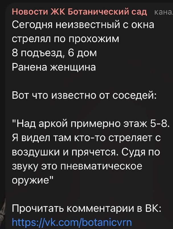 В Воронеже в ЖК « Ботанический сад» зафиксированы случаи стрельбы из пневматического оружия. Стрельбы происходят возле восьмого подъезда дома №6. В течение трех дней неизвестный стрелок ведет огонь по прохожим, после чего скрывается. Местные жители обеспокоены сложившейся ситуацией и выразили опасения о возможной безнаказанности нарушителя общественного порядка.