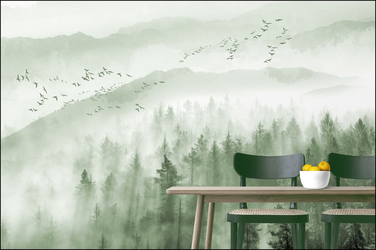 Фотообои в пастельных оттенках зелёного "Лес и горы"