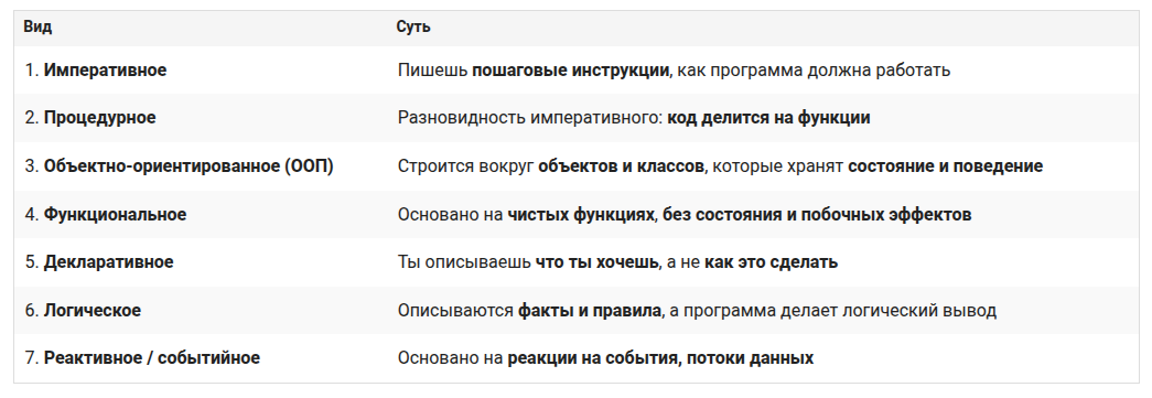 Существует несколько основных парадигм программирования — способов мышления и организации кода. Каждая из них предлагает разный подход к решению задач, и часто они смешиваются в современных языках (включая Python).