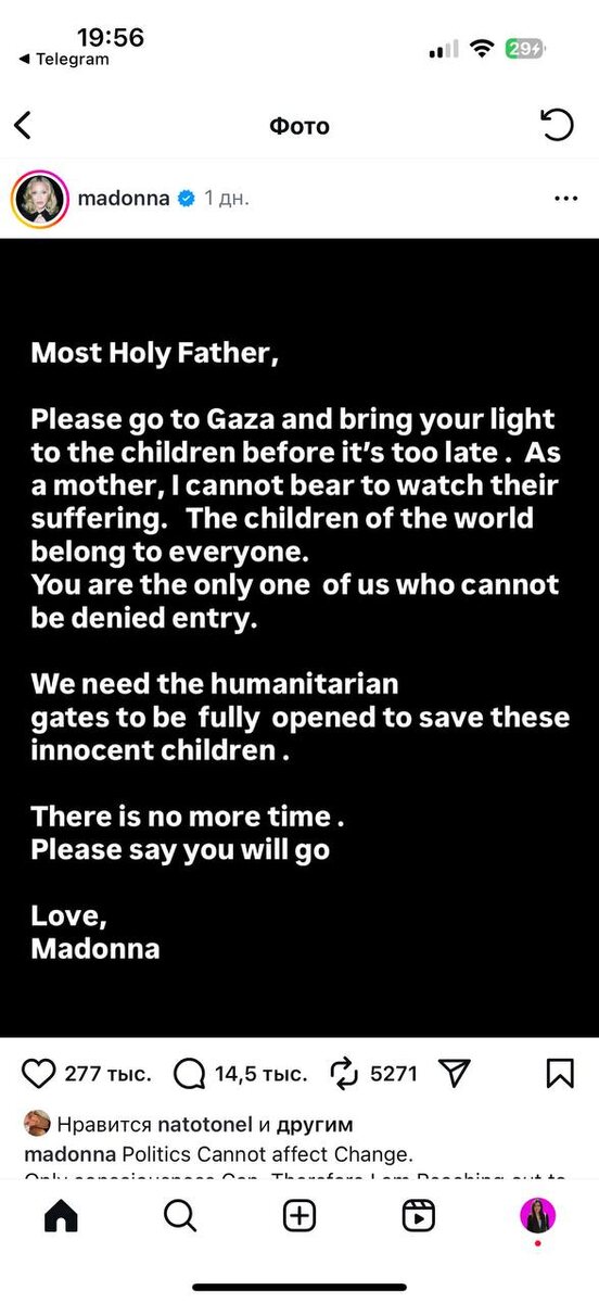 Мадонна снова в политике — просит Папу Римского приехать в Газу. В качестве подарка на день рождения её сыну. Заложников тоже упомянула