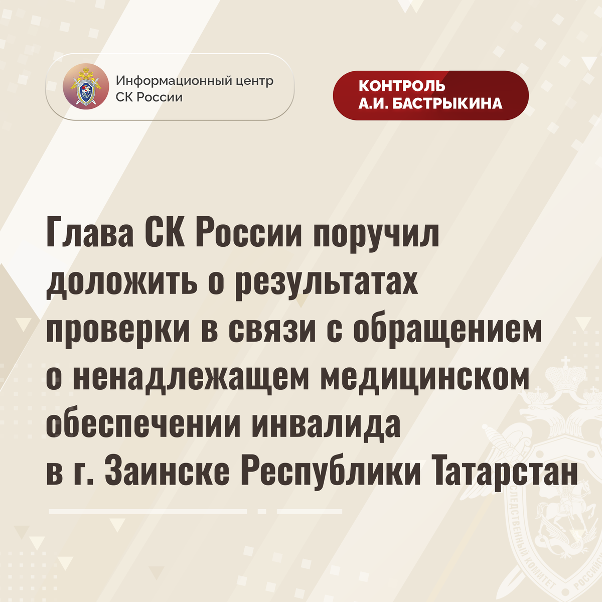 Глава СК России поручил доложить о результатах проверки в связи с обращением о ненадлежащем медицинском обеспечении инвалида в г. Заинске Республики Татарстан В комментариях в аккаунте приёмной Председателя СК России А.И. Бастрыкина «ВКонтакте» опубликовано обращение по вопросу нарушения прав мужчины-инвалида из города Заинска Республики Татарстан на качественное медицинское обеспечение. С мая текущего года заявителю не предоставляется жизненно необходимый лекарственный препарат. При этом приобретать медикамент за свой счет мужчина не имеет финансовой возможности. Обращения в компетентные органы результатов не принесли. В СУ СК России по Республике Татарстан организована процессуальная проверка. Председатель Следственного комитета Российской Федерации Александр Иванович Бастрыкин поручил руководителю СУ СК России по Республике Татарстан Валерию Андреевичу Липскому доложить о промежуточных результатах процессуальной проверки и принятом по итогам решении. Исполнение поручения, а также х