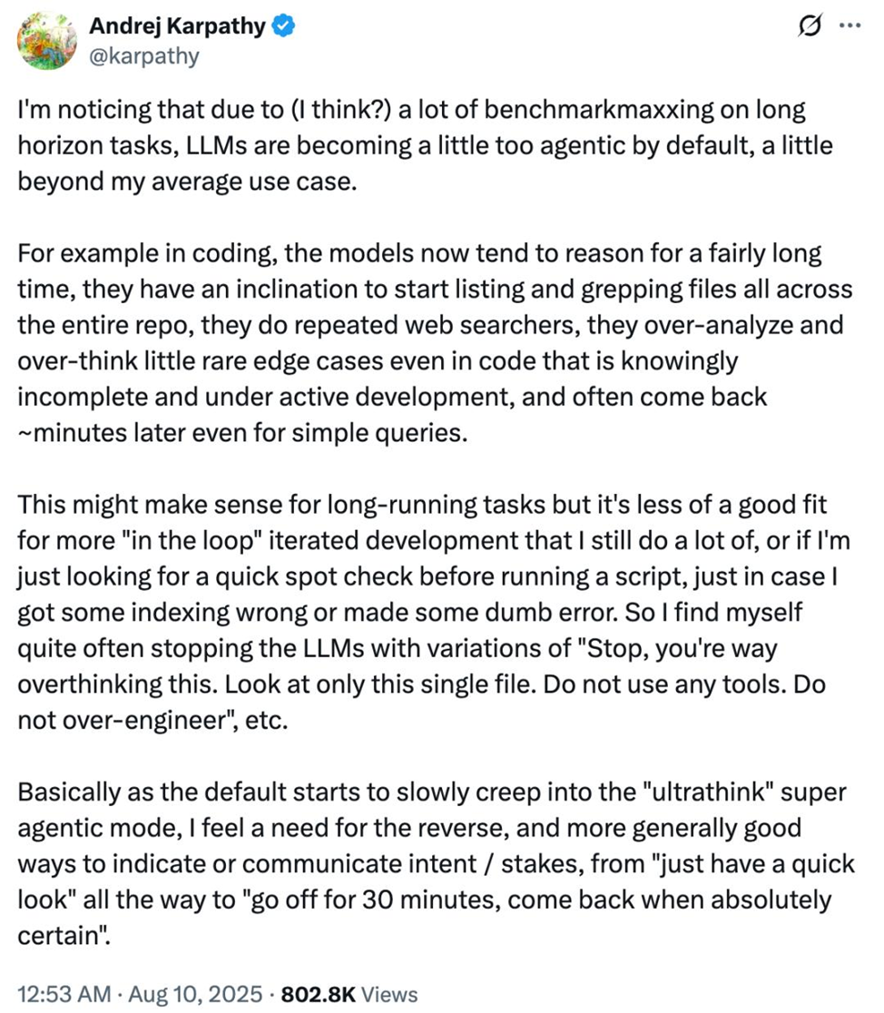 С появлением «мыслящих» моделей и техник вроде цепочек рассуждений мы получили то, о чём мечтали: универсальные помощники, умеющие планировать, раскладывать сложные задачи на шаги и объяснять ход мыслей. Но вместе с этим пришёл побочный эффект: ИИ всё чаще «перемудривает» там, где нужна быстрая и прямолинейная помощь. Андрэй Карпати сформулировал это предельно метко: по умолчанию LLM становятся излишне «агентными», даже когда от них ждут всего лишь «быстрый взгляд». В кодинге это видно особенно ярко. Модель запускает длительное «глубокое размышление», обходит весь репозиторий, бесконечно гуглит, анализирует краевые кейсы, а пользователю была нужна простая проверка индекса перед запуском скрипта. Приходится обрывать: «Стоп. Смотри только этот файл. Не используй инструменты. Никаких сверхдизайнов». В повседневных задачах происходит то же: вместо краткого ответа — длинная «мысль вслух», вместо элементарной правки текста — экзаменационное эссе. Свежие примеры с GPT‑5 лишь усилили раздражен