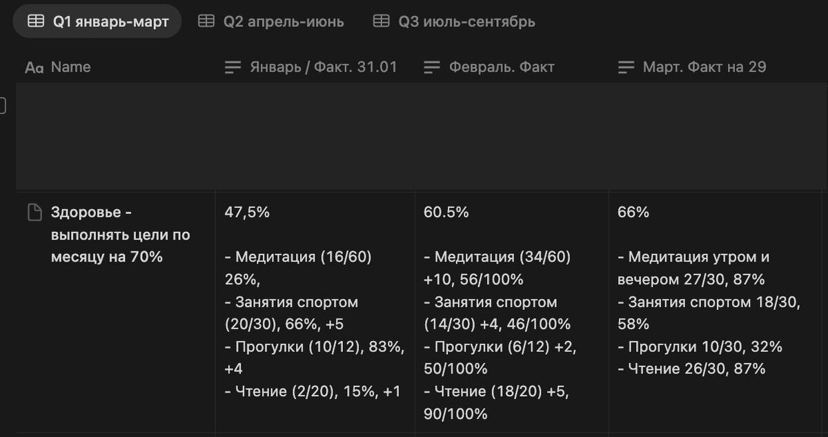 Про движение к целям В начале года я запустил для себя эксперимент — попробовал ставить себе цели и фиксировать изменения. Глобальная идея, на самом деле, не столько достичь целей, сколько привить себе привычку постоянства: делать что-то, чтобы двигаться в каком-то направлении более или менее постоянно. Как говорил выше, результат — это скорее вишенка на торте. Куда важнее само постоянство движения и желательно вверх. Давайте посмотрим на примере 3 кварталов, как менялись результаты и почему. Это будет единая цифра в качестве среднего процента от всех активностей в цели: 1. Q1 январь 2025 — 47.5%. Я только начал трекать цели и тогда долго думал какую книгу начать читать 😂 2. Q1 февраль 2025 — 60.5%. Я прям впрягаюсь в трекинг: выстраиваю себе план тренировок через АИшку, каждое утро заставляю себя медитировать и заниматься спортом. Параллельно начинаю активнее искать работу после каникул 3. Q1 март 2025 — 66%. Просто сохраняю темп 4. Q2 апрель 2025 — 50%. Приходит первое разочарова