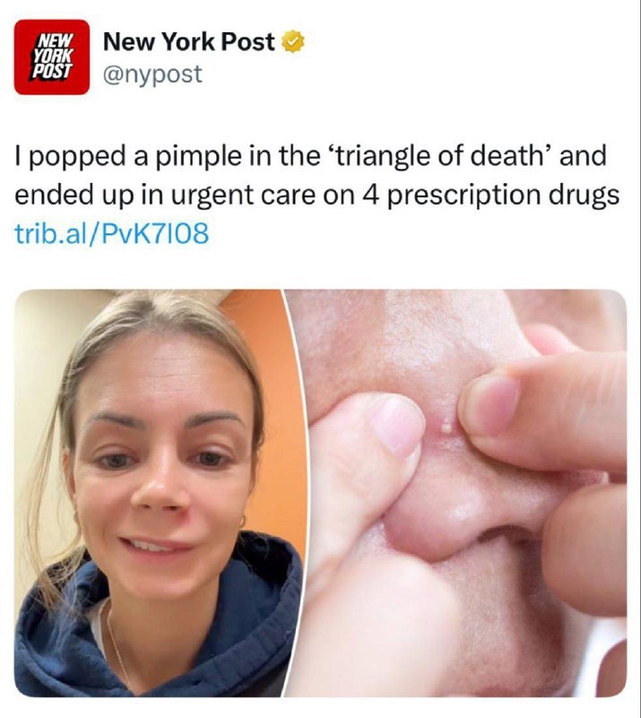 ⚡️Медики напоминают, что область от переносицы до уголков рта — опасная зона. Любая инфекция, попавшая сюда через открытую ранку, может вызвать слепоту, инсульт, паралич или даже смерть.