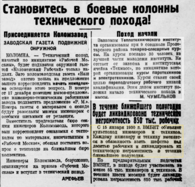 Какая же гениальная идея пришла в головы советским начальникам в ноябре 1929 года! На дворе - пятилетка в четыре года, а технических специалистов – откровенно не хватает. Их и так в России до революции не хватало, а за годы строительства нового общества самые сообразительные уехали, кое-кого – расстреляли, некоторых арестовали и посадили в лагеря или собирались посадить. Конечно, кто-то остался, но мало. А среди рабочих грамотных мастеров еще меньше. Что делать? Конечно, объявить культпоход «все на борьбу с технической неграмотностью». В ноябре 1929 года советские газеты, начиная с «Известий» и заканчивая рязанской губернской газетой «Рабочий путь» от 16 ноября 1929 года опубликовали на первых полосах призывы к инженерам и техникам: «Ликвидировать техническую неграмотность С 15 января 1930 г. ВМБИТ объявляет культпоход инженеров и техников. Каждому инженеру и технику вменяется в обязанность взять шефство над десятью рабочими и ликвидировать их техническую неграмотность в течение ближай