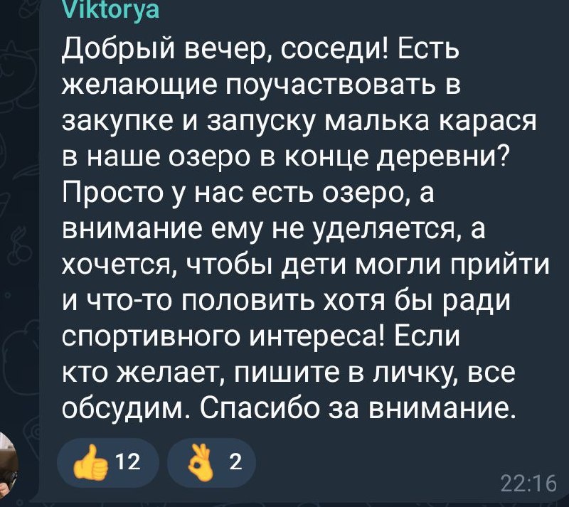 Пока я выпала из реальности, в нашем селе вон уже решили рыбу разводить всем миром. Там уже и до очистки озера договорились, глядишь ещё и пляж облагородят... Пример действия гражданского общества. #сельскийчат
