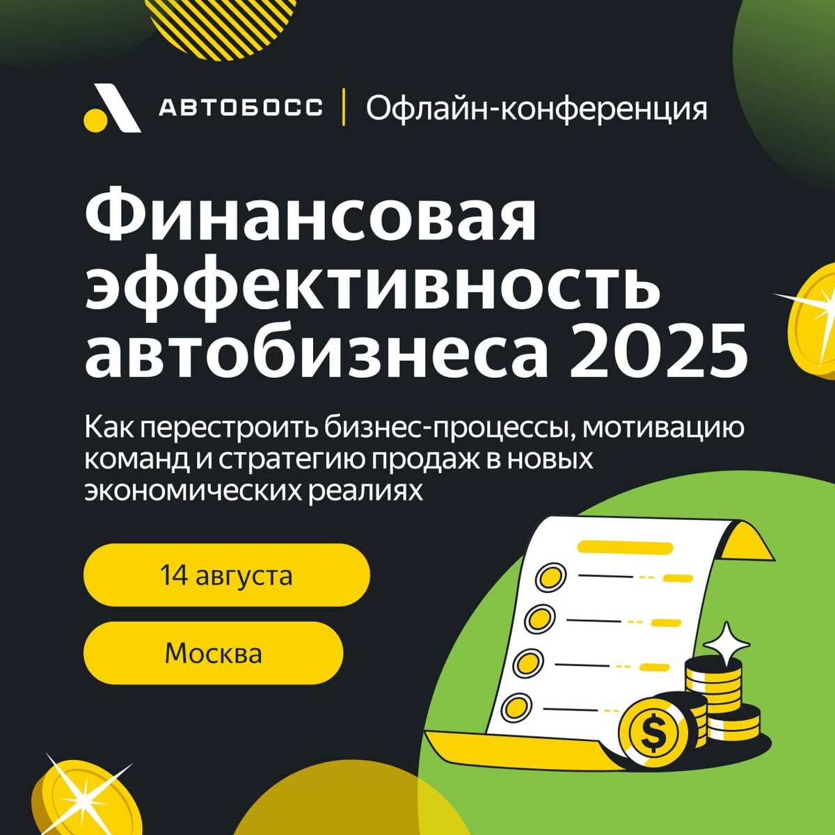Осталось немного времени до главной финансовой конференции этого года — и вы еще можете стать ее участником! 🔔 14 августа на мероприятии АвтоБосс эксперты автобизнеса обсудят, как перестроить бизнес-процессы, мотивацию команд и стратегию продаж в новых экономических реалиях — чтобы сохранять прибыль даже при падении автокредитования и низкой маржинальности основных операций. Среди тем обсуждения: ⚫️Анализ актуальной макросреды: экономика, регуляторы, рынок ⚫️Обсуждение финансовой модели: адаптация и устойчивость в кризис ⚫️Перезагрузка стратегии продаж на фоне новых реалий ⚫️Рассмотрение новой роли кредитования и страхования в прибыли Среди спикеров: ЦБ РФ, АРБ, ГК АВТОДОМ, АвтоСпецЦентр, МБ РУС, ГК Большегруз, эксперты автобизнеса, Автомаркетолог, РАТ, ORWO. Подробная программа и регистрация по ссылке 🔗