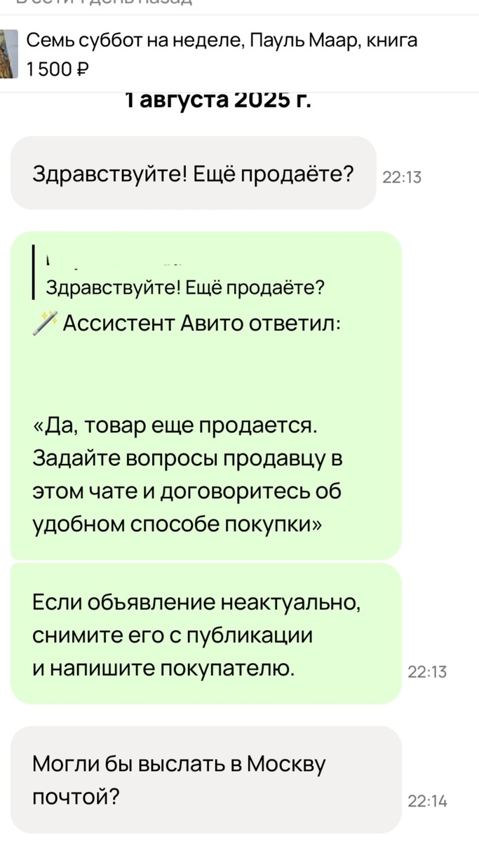 Всем доброго времени суток! За неделю до отпуска перестала размещать объявления на авито и они все уходили в архив. За сутки до того как уехать убрала авито доставку. Но несмотря ни на что все таки случилась у меня переписка с покупателем пока была в отпуске. Ассистент авито конечно ответил, что продаю, но я всегда еще отвечаю покупателем сама. Покупатель захотел купить детскую книгу Пауля Маара "Семь суббот на неделе ". Это моя домашняя детская книга. Она мне очень нравилась, поэтому хорошо так ее зачитала. Обложка у книги слегка потрепана, но страницы все на месте, корншок не растрескан. На эту книгу почему то заоблачные цены по моему мнению. Дешевле, чем за 1200 я не нашла. А в хорошем состоянии так и за 2000 рублей продают. Как приехала с отпуска написала женщине, что если она не передумала, то может заказывать. Видно книга была нужна, она тут же её заказала. В Москву шла не долго, всего 3 дня и была получена на следующий день. Я получила свои 1372 рубля и слова благодарнос