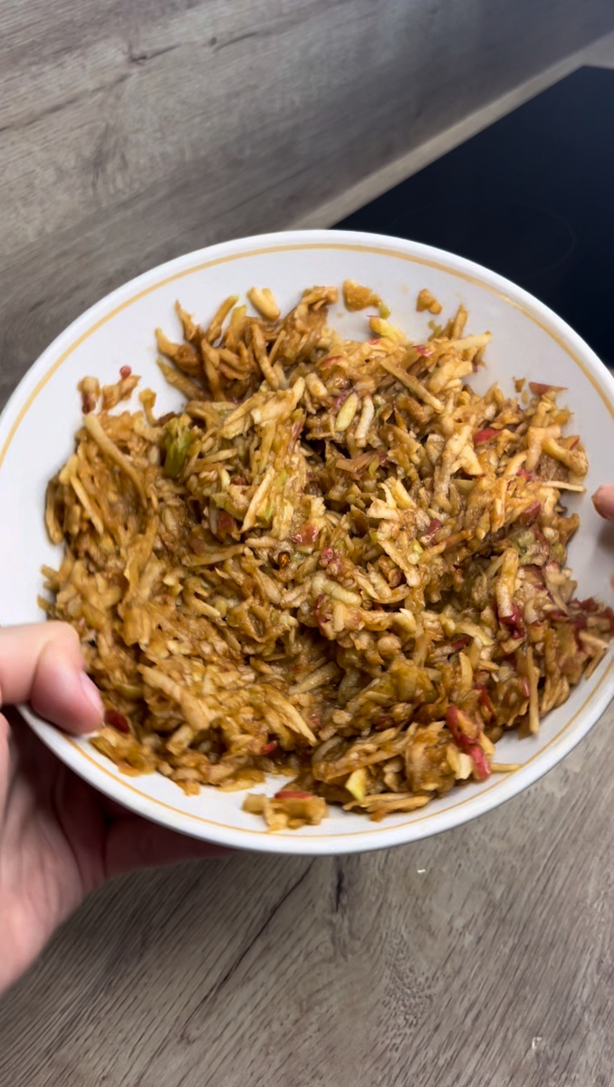 Пирог по этому рецепту готовится очень легко и быстро, справится даже ребенок! Здесь не придется замешивать тесто, ждать пока оно подойдет, все максимально просто, как мы все любим! И так приступим, для приготовления нам понадобится: -сахар - 1 стакан (~180 гр) -мука - 1 стакан (~130 гр) -манная крупа - 1 стакан (~160 гр) -масло сливочное - 70 гр -разрыхлитель - 12 гр -молоко - 100 мл -яблоки - 800 гр -сахарная пудра - по желанию Яблоки натираем на крупной терке. Я это делала прям с кожурой, вы можете при желании снять. У меня были садовые сладкие яблоки. Делим массу на 3 части, столько будет слоев с яблоками. Далее приготовим сухую смесь. В миске смешиваем три стакана - стакан манки, стакан сахара, стакан муки и добавляем сюда же разрыхлитель. Всю смесь перемешиваем. Делим полученную смесь на 4 части, столько у нас будет слоев «теста». Масло предварительно охлаждаем и натираем на крупной терке в отдельную тарелку. Начинаем сборку пирога. У меня было кольцо диаметром 24 см,