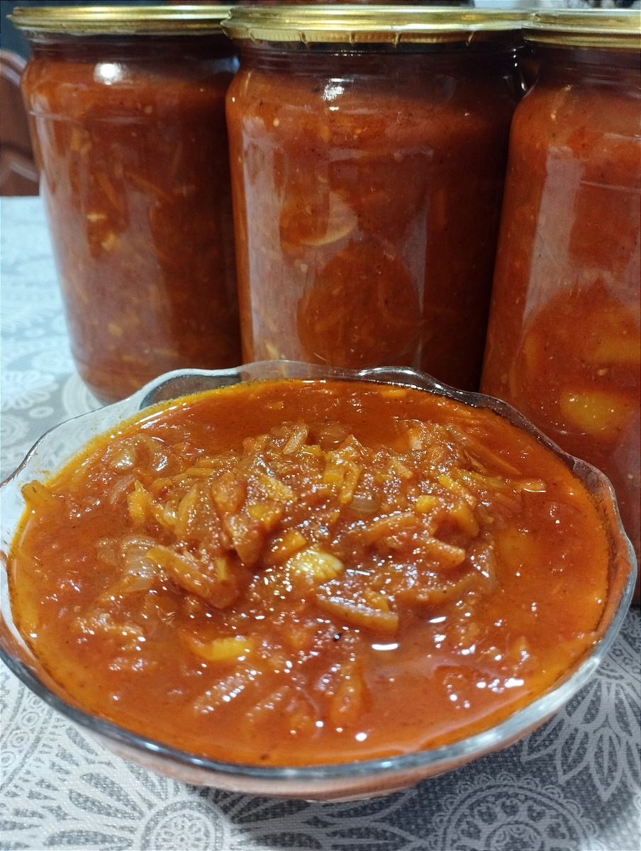 Очень вкусная и пикантная закуска на зиму с морковью станет настоящей выручалочкой. Прекрасно подойдёт к жареной картошечке и к мясу, а также как самостоятельное блюдо, когда хочется чего нибудь быстро перекусить. Ингредиенты Помидоры 5 кг Морковь 1 кг Лук репчатый 700 г Перец болгарский 500 г Чеснок 100 г ( очищенный ) Хмели сунели 3 ст.л. с горкой Кориандр молотый 1 ст.л. Паприка сладкая 1 ст.л. Гвоздика 3 шт Перец горький по вкусу Соль 80-85 г Сахар 110 г ( если помидоры кислые, сахара может понадобиться больше) Уксус 9 % 25 мл Масло растительное 250 г Приготовление Помидоры перекрутить через мясорубку и хорошо проварить на медленном огне с момента закипания примерно 2-2,5 часа. Для этого рецепта лучше подойдут мясистые помидоры, в них много мякоти и меньше сока. Если вам попались томаты с большим количеством сока, тогда нужно их уваривать дольше, чтобы выпарилась лишняя жидкость. 1 кг моркови натереть на тёрке для корейской моркови. После того, как томатная основа будет готова,