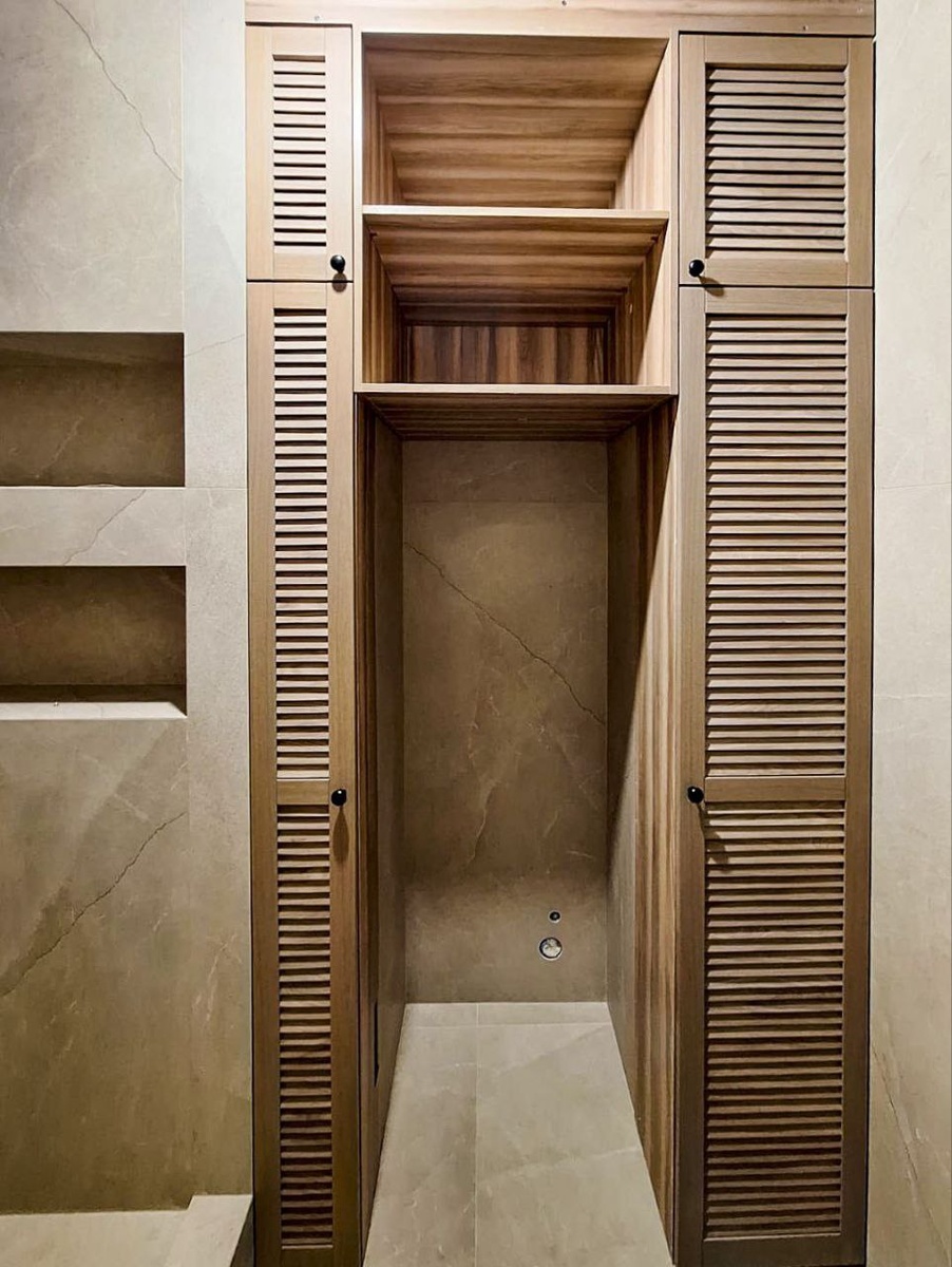Завершили сборку мебели в санузле у Александрины и Ильи на Рязанском проспекте. В этом проекте мы объединили функциональность, эстетику и настоящую заботу о деталях: — Вместительный шкаф в душевой идеально подходит для хранения всего необходимого — от полотенец до бытовых мелочей. — Для стиральной и сушильную машины выделен отдельный шкаф — пространство выглядит аккуратно, при этом очень эргономично. — Изящная подвесная тумба из МДФ в белой эмали с интегрированной раковиной из искусственного камня дополнена премиальной системой скрытого слива. — Не забыли и о практичности — предусмотрен шкафчик над инсталляцией. Главной изюминкой интерьера стали жалюзийные двери из натурального дуба: они обработаны итальянским маслом (тонировка Холодный серый), что сохраняет текстуру дерева и придаёт мебели особое благородство. Корпус шкафов выполнен из качественного ЛДСП, отлично подходящего по цвету к фасадам - Nordeco Ясень Ориноко. Современный санузел, где каждая мелочь создана с вниманием и лю