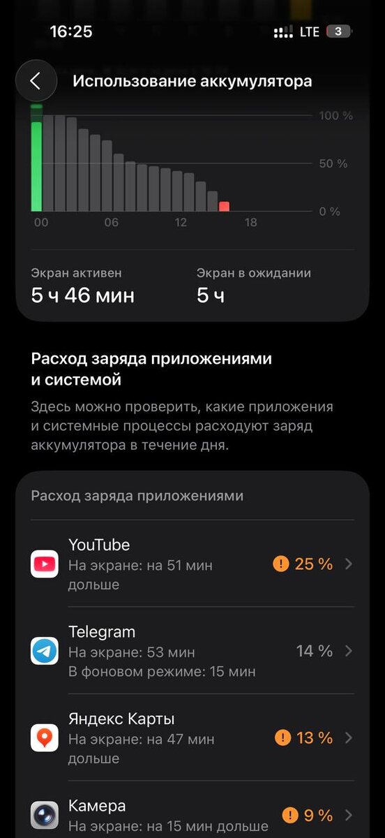 В ответ на пост ⚡️Автономность iOS 26 Beta 6 Снял с зарядки в 00:54 и активно пользовался до 08:00 утра, а потом с 13:00. В итоге в 16:25 оставалось 3%. По условиям все стандартно для меня: LTE на двух симках, вайфай/сотовая сеть 50/50 по времени. Яркость 50%. Как обычно соцсети, браузер, ютуб, навигация. Айфон 16 Про, емкость аккума 96%. Always On и 120гц включены. В итоге чуть больше 5,5 часов экрана, на час меньше, чем на прошлой бете. Видимо расплата за новые анимации😁 Как у вас?🤔