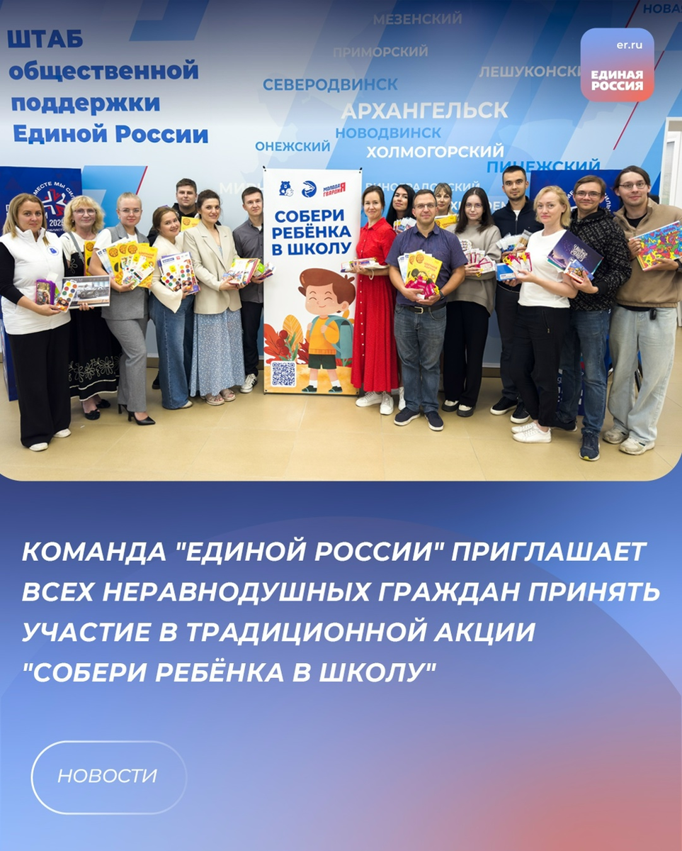 В преддверии нового учебного года команда "Единой России" приглашает всех неравнодушных граждан принять участие в традиционной акции "Собери ребёнка в школу". Цель акции – оказать помощь в подготовке к учёбе детям, которые нуждаются в особой поддержке: детям участников СВО, детям-инвалидам, детям из многодетных и малообеспеченных семей, а также детям из новых регионов. В рамках инициативы партийцы, общественники и волонтёры собирают и передают школьные принадлежности, канцелярские товары и другие необходимые для учёбы вещи семьям, которые испытывают трудности с обеспечением детей всем необходимым к началу учебного года. Присоединиться к акции может каждый! Приносите канцелярские товары и другие школьные принадлежности в Штаб общественной поддержки по адресу: г. Архангельск, ул. Поморская, 5. Ваша помощь станет неоценимым вкладом в будущее детей! #ЕР29 #ЕдинаяРоссия #Архангельскаяобласть