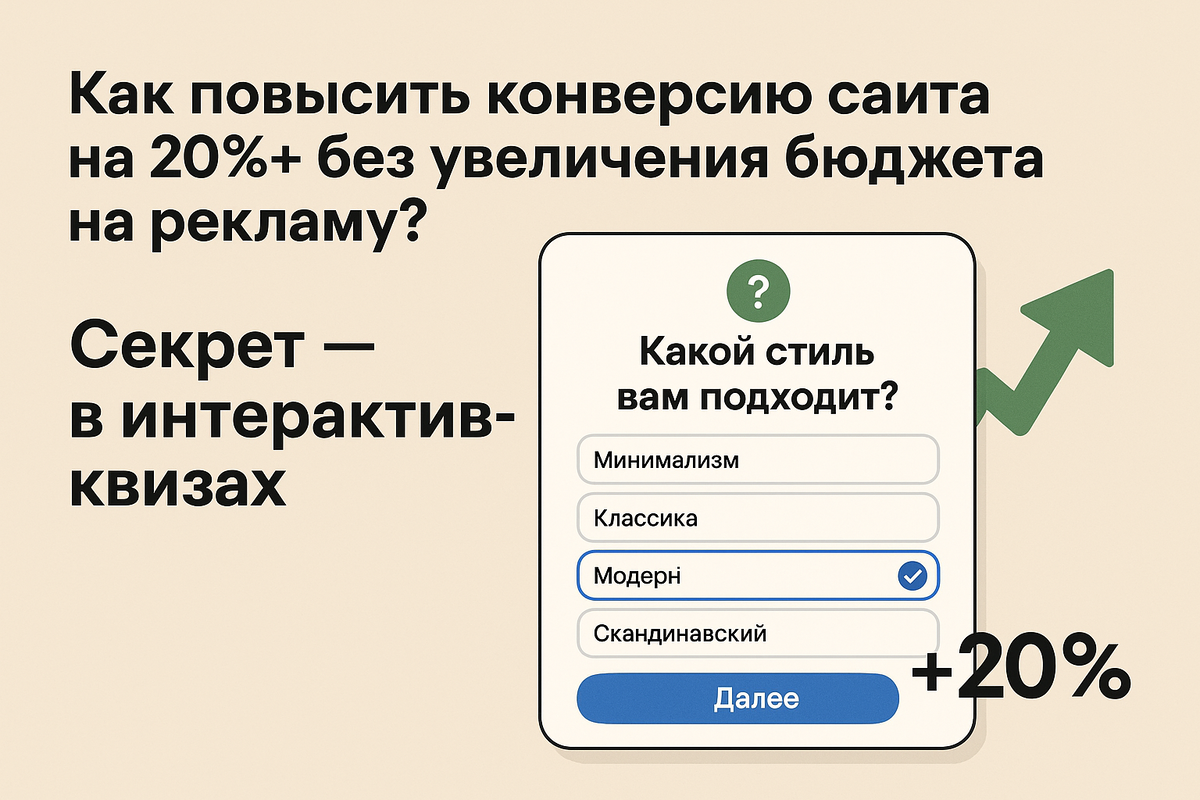 Знакомая ситуация? Вы вкладываете деньги в Яндекс.Директ или таргет, на сайт идет трафик, посетители что-то смотрят... и уходят. Заявок и продаж критически мало. Стандартная форма "Оставьте имя и телефон" вызывает у людей только зевоту. В итоге бюджет на рекламу сгорает, а вы остаетесь с минимальным результатом. Кажется, что это замкнутый круг. Но что, если я скажу, что можно поднять конверсию сайта на 20, 30, а то и 50%, не вливая ни копейки сверху в рекламу? Решение — сделать ваш сайт интересным для пользователя. И лучший инструмент для этого сегодня — интерактивный квиз. Давайте на практическом примере разберем, как с помощью конструктора Квиза вы можете превратить уходящих посетителей в горячих клиентов. Как это работает и почему это несложно? Квиз — это не просто тест, это пошаговый диалог с клиентом, который вовлекает его в процесс и мягко подводит к оставлению заявки. Вот как это решает главные проблемы вашего сайта. 1. Захват внимания вместо скуки