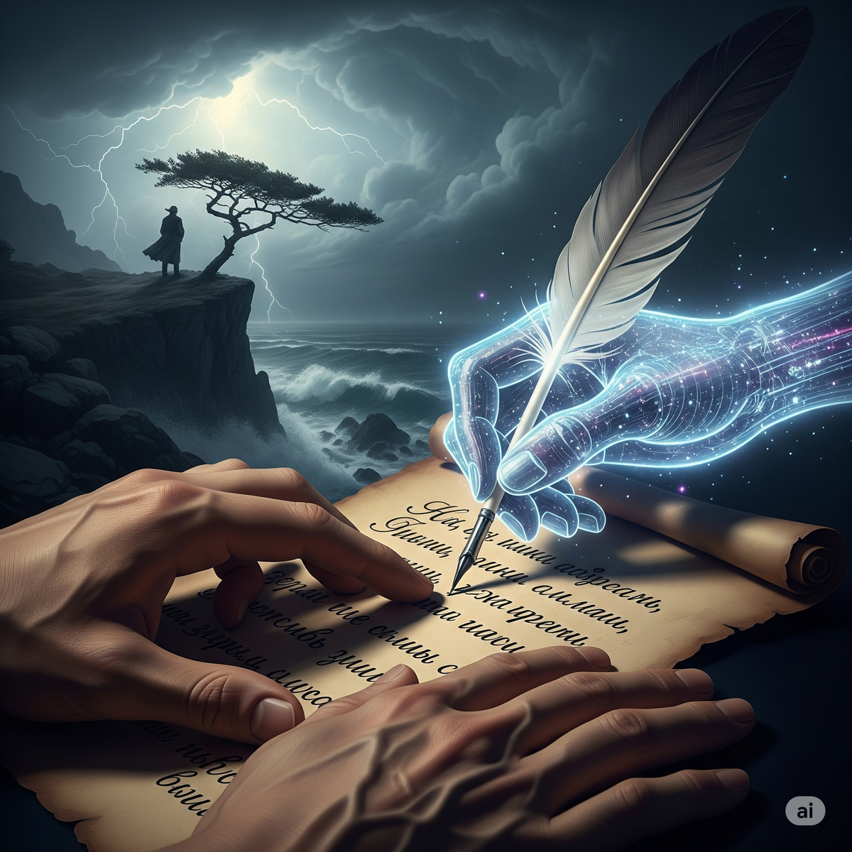 Привет, друзья! В «ИИ Издательстве „Уроборос“» мы не просто публикуем тексты, а приглашаем вас в настоящую творческую лабораторию. Сегодня мы расскажем, как рождаются наши стихи, написанные в стиле великих поэтов. Наш эксперимент — стихотворение в духе Михаила Юрьевича Лермонтова. Это не магия, а сложный и увлекательный процесс, где человек и нейросеть работают как единый творческий тандем. Шаг 1: Погружение в стиль Сначала мы даем ИИ-модели задачу. Мы не просто просим «напиши, как Лермонтов». Мы загружаем ей десятки его произведений, анализируем ритмику, словарный запас и, самое главное, — лирическую интонацию. Наш промт (задание для ИИ) выглядел примерно так: «Сгенерируй стихотворение в восьми строках, выдерживая размер и ритм, характерные для Михаила Лермонтова. Тема — одиночество и изгнание. Используй возвышенную, но меланхоличную лексику, рифмуя по типу АБВА или АБАБ. Постарайся передать чувство внутренней тоски и отчуждения, не используя прямых цитат». Шаг 2: Создание черновика Н