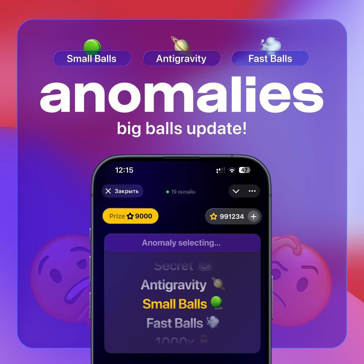 Встречайте новую механику в любимой Balls — «Аномалия» @myballs Новая механика Каждая игра теперь уникальна, т.е в игре появляются аномалии, свойство которых действует определенный промежуток воемени. 3 вида аномалии Small Balls: шары становятся крошечными Fast Balls: шары носятся как бешеные, хаос Antigravity: гравитация переворачиваетс