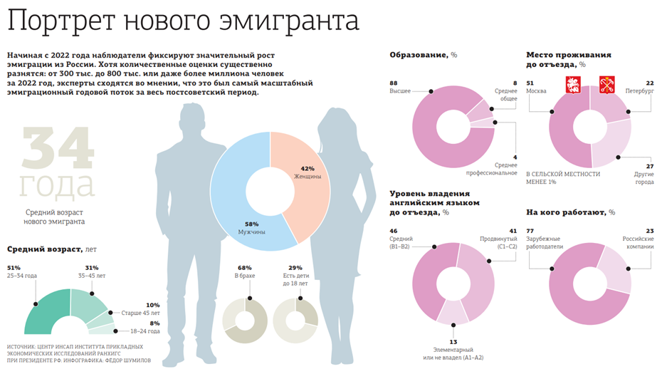 К таким выводам пришли авторы статьи "Новые эмигранты и российский рынок труда: эмпирический анализ", опубликованной в научном журнале "Проблемы прогнозирования". Специалисты Института прикладных экономических исследований РАНХиГС при президенте РФ провели масштабный опрос среди релокантов и даже составили портрет среднестатистического эмигранта последней волны.