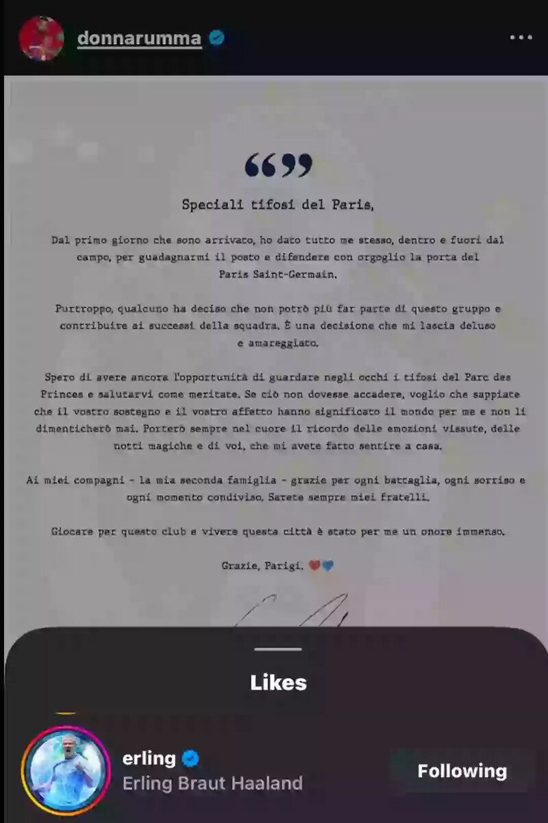 Джанлуиджи Доннарумма уходит из «ПСЖ». Похоже, что в «Манчестер Сити». Если вы не доверяете слухам, то вас можно лишь похвалить. Но что тогда значит это? Эрлинг Холанд лайкнул пост Доннаруммы, посвященный уходу из «ПСЖ». Вряд ли Эрлинг делал подобное раньше – он никогда не играл в одной команде с Доннаруммой и лишь несколько раз встречался с ним на поле. Тут одно из двух – либо они друзья, либо о переходе Доннаруммы в «Сити» знают даже игроки. 💣 Уход Доннаруммы взорвал соцсети: турецкие фанаты уверены, что он пополнит их лигу, болельщики «МЮ» ждут у себя. Но... Джанлуиджи нашел другой новый клуб! 🔥