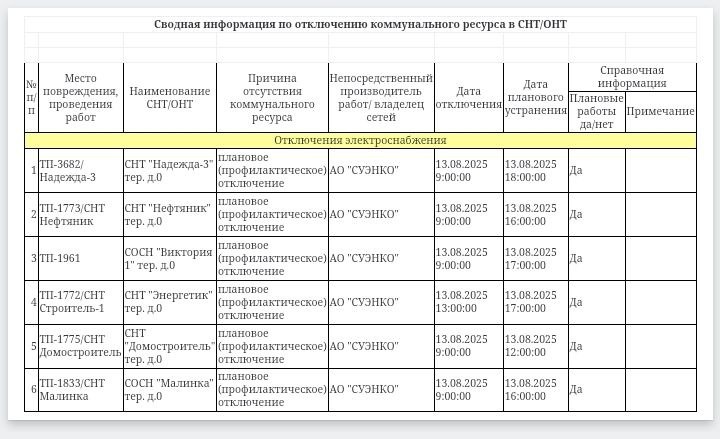 Информация по плановым отключениям в СНТ/ДНТ на 13.08.2025 от ЕДДС города Тюмени