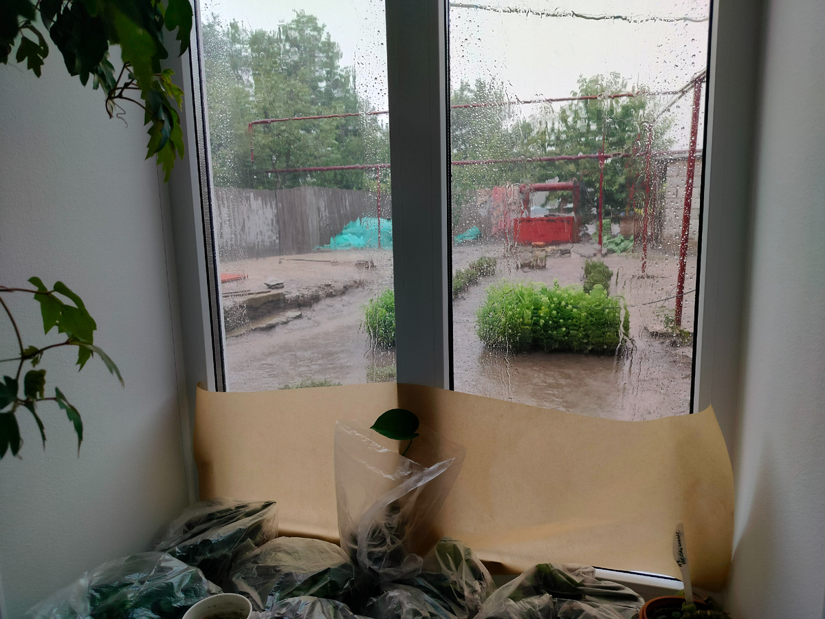 Утро выдалось приятно холодное, ещё бы после такой жары ,вчера прошел дождь и принес с собой долгожданную свежесть и прохладу . Днём светило солнышко приятно согревая своим теплом, уже не было той невыносимой летней жары , надеюсь мы с ней попрощались до следующего года и остаток лета , как и начало осени природа будет радовать просто тёплыми деньками. Потихоньку переукореняю свои фиалочки , видно на фото кулёчки ,которые их прикрывают создавая благоприятный микроклимат, в этот раз при пересадке в грунт добавила вместо вермикулита перлит , решила попробовать , может будет лучше , что-то в этом году фиалки не важные . Зато радовала Кроссандра , её вместе с Гибискусами я вынесла на летние каникулы под тень черешни и ей любительнице большого количества света и тепла понравилась такая жизнь Сейчас её у меня нет отдала в добрые руки , к сожалению у меня на окнах такому большому кусту нет места . Гибискусы цветут ежедневно единичными цветами в доме они не цвели вообще, фото нет жду бол