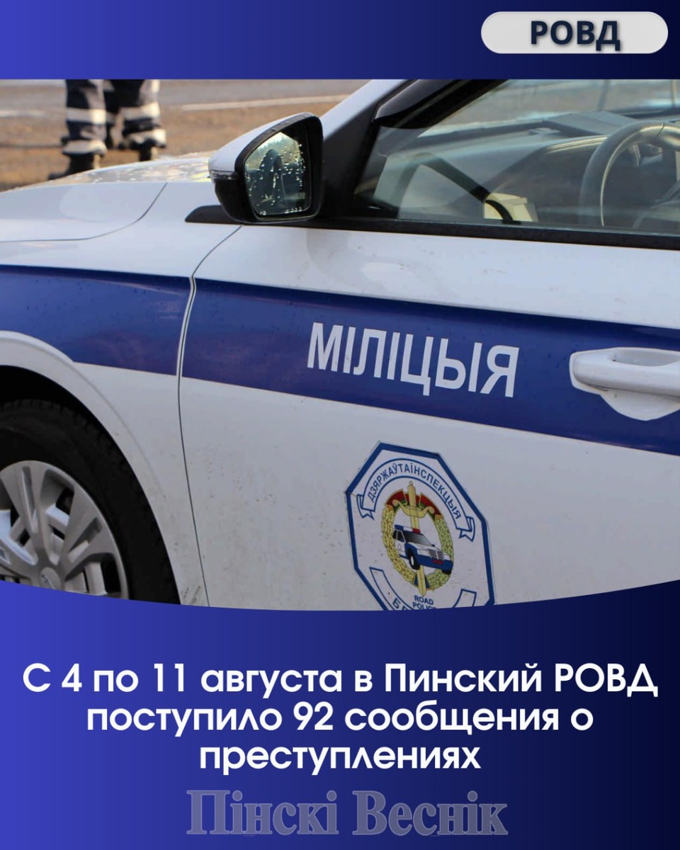 🤍С 4 по 11 августа в Пинский РОВД поступило 92 сообщения о преступлениях, административных правонарушениях и происшествиях и пять – о