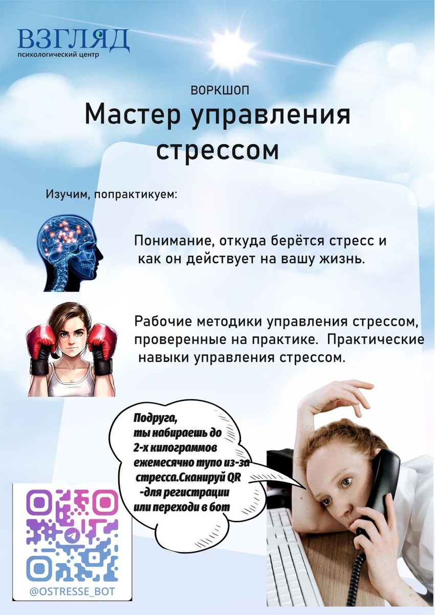 Воркшоп: «Мастер управления стрессом» (Воркшоп – это интерактивное мероприятие, которое объединяет обучение и практику, часто в небольшой группе, с целью получения новых знаний, навыков и опыта) Формат: Онлайн (при наборе группы офлайн, будем заниматься в центре «Взгляд») Регистрация: t.me/ostresse_bot (после регистрации вас сразу распределят в закрытую малую группу) Стоимость месячного участия в воркшопе — 7500 рублей. (оплата после распределения в группы) Знаете ли вы, что из-за постоянного стресса вы можете набирать до двух килограммов лишнего веса ежемесячно? Стресс — наш вечный спутник в сегодняшних реалиях. Но он может превратиться из врага в верного союзника, если вы научитесь им управлять. Приходите на воркшоп «Мастер управления стрессом», и вы получите: 1. Понимание, откуда берётся стресс и как он действует на вашу жизнь. 2. Рабочие методики управления стрессом, проверенные на практике. 3. Практические навыки управления стрессом. Работа в закрытой группе до 10 человек, в к