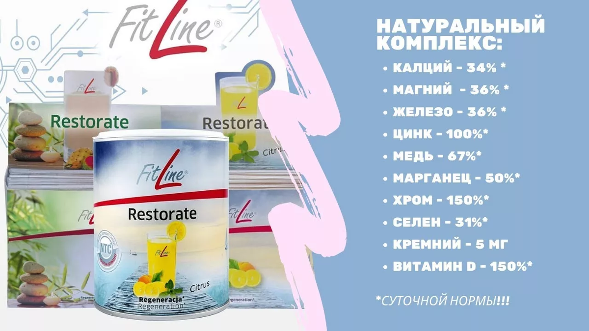 ОСНОВНЫЕ ПРЕИМУЩЕСТВА FITLINE RESTORATE • В напитке Fitline Restorate тщательно подобран сбалансированный состав веществ, который обеспечивает идеальное дополнение при несбалансированном питании или при повышенной потребности организма в определенных веществах. • Fitline Restorate поставляет в организм жизненно важные минеральные вещества и микроэлементы, подобранные в специальных пропорциях и комбинациях, способствующих их полному усвоению (благодаря наличию фруктозы и лимонной кислоты): кальций, магний, калий, цинк, селен, марганец, медь, хром. Содержит также важный антиоксидант – бета-каротин, усиливающий своё действие на организм благодаря взаимодействию с минералами. • Fitline Restorate способствует восстановлению кислотно-щелочного равновесия, обеспечивает оптимальную нейтрализацию кислот. • Fitline Restorate необходим организму для воспроизводства и поддержания здорового состояния костей, кожи и волос, а также для функционирования сердца и мышц, для ферментного обмена веществ, д