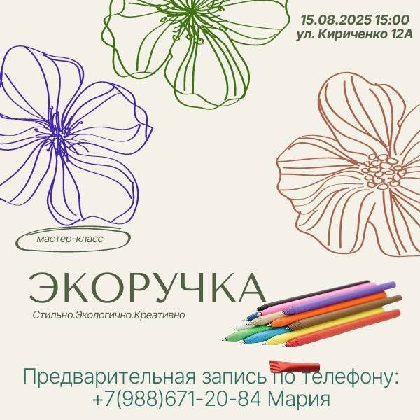 Мастер-класс «ЭКОРУЧКА» ✍️🌱 Творчество + экология = полезный аксессуар! Приглашаем вас на мастер-класс по созданию стильных и экологичных ручек из бумаги и картона. 📅 Дата: 15 августа 2025 г. ⏰ Время: 15:00 📍 Место: ул. Кириченко, 12А (молодёжный центр) В программе: ✔️ Изготовление ручки из переработанных материалов ✔️ Декорирование на свой вкус ✔️ Польза для природы и стильный аксессуар в одном! Готовую ручку забираете с собой — удобно, экологично и креативно! 📲 Запись обязательна: +7(988)671-20-84 (Мария) Создадим полезные вещи с заботой о планете вместе! ♻️✨