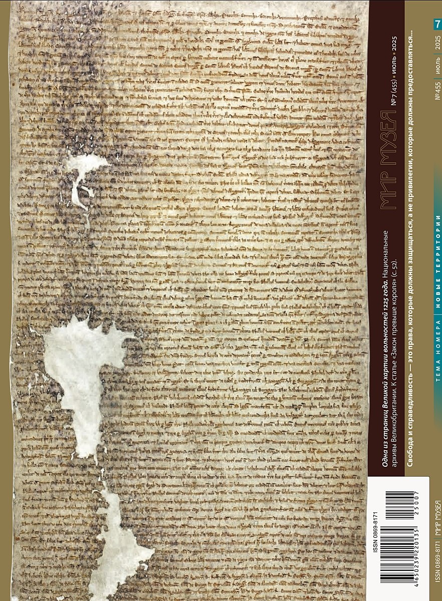 На четвёртой странице обложки июльского номера журнала «Мир Музея»: Одна из страниц Великой хартии вольностей 1225 года. Национальные архивы Великобритании. К статье «Закон превыше короля» Свобода и справедливость - это права, которые должны защищаться, а не привилегии, которые должны предоставляться... #мирмузея #обложкимирмузея