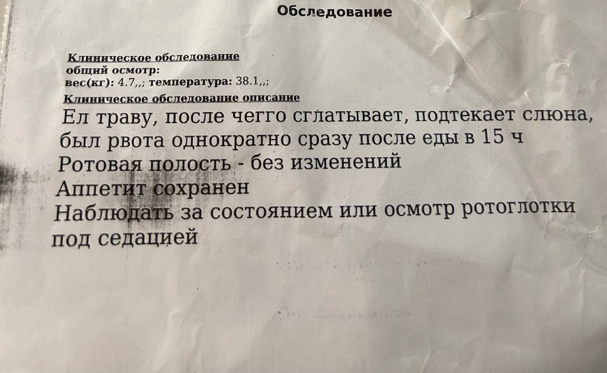 Начну с конца: кот поправился! Теперь всё по порядку. Этим летом коты подсели у меня на обычную траву, трое умерено, а один прям с фанатизмом. Наяривал как не в себя и донаяривался. И вот 3 дня назад, ночью, я услышала странные булькающие звуки. Встала посмотреть и увидела кота в ужасном состоянии: вяло сидит, глаза прикрыты, весь холодный, из пасти течёт густая слюна вперемежку с пеной. Пока я соображала что делать, слюна прекратилась и кот вроде ожил. Я решила посмотреть за ним до утра. Утром кот поел, попил и у него опять началась слюна и пена. При этом он издавал булькающие звуки. Потом его начало тошнить и рвать и тут уже мы отправились в ветклинику. Вариантов у меня было два: или отравление или травинка застряла в пищеводе. Клиника знакомая, не раз пользовались их услугами, проблем не было. В клинике сидело в очереди три кота и одна собачка, я, получается, четвёртая была. Вызывали примерно раз в 30 мин. по имени животного. Параллельно основной очереди, появлялись разные люди,