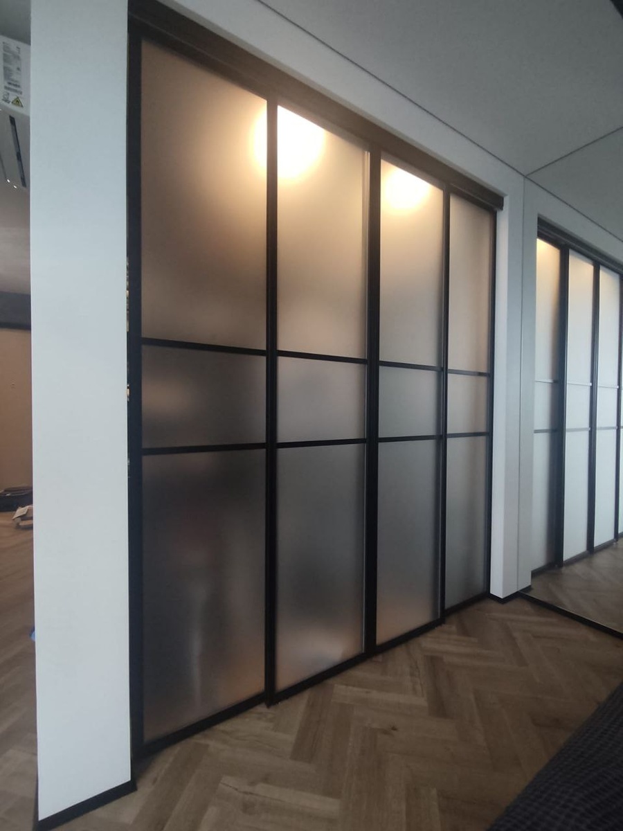 Шкаф-гардеробная, размещённый в нише, выполнен с двумя дверями и тремя функциональными секциями. Материал дверей — матовое стекло Мателюкс с бесцветной плёнкой, профиль Massive — элегантного чёрного матового оттенка. Двери оснащёны синхронным механизмом открывания дверей.