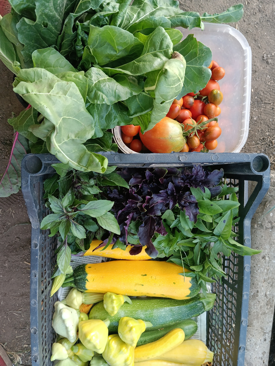 Сын уехал в Севастополь, дочь работает 2 через 2, Володя - каждый день. Поэтому в магазин я не ходила почти неделю. Интересно было, как мы проживём, если больших закупок не делать. Благодаря даче - нет необходимости покупать овощи. Яйца стабильно несут мамины курочки. Что готовим из своего урожая? Кабачковые оладушки. Почти ежедневно - салаты из помидоров с мангольдом и базиликом. Квашеные баклажаны с морковью: Тут же огурчики в горчице. 👆 Аджику делаем: Компоты из яблок или винограда, с базиликом и мятой. Фаршированные цветы цукини: И заготовки на зиму, конечно, ежедневно делаем. В дегидратире: И в баночках: Пока стандартные, проверенные рецепты отработали, программу-минимум. Дальше будем пробовать что-то новое из рецептов. Хороших урожаев всем!