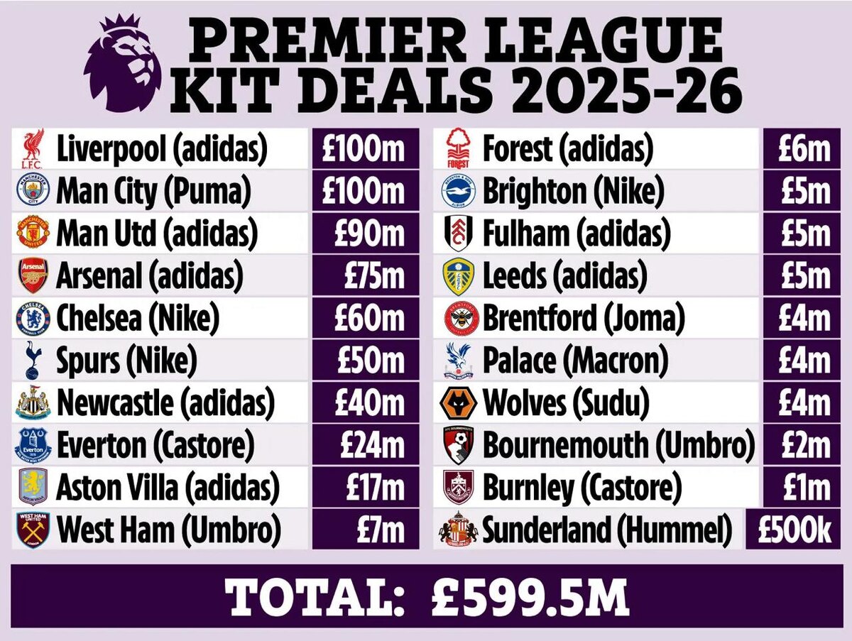 Сколько клубы Премьер-Лиги получат от своих технических спонсоров за сезон 2025/26 👕