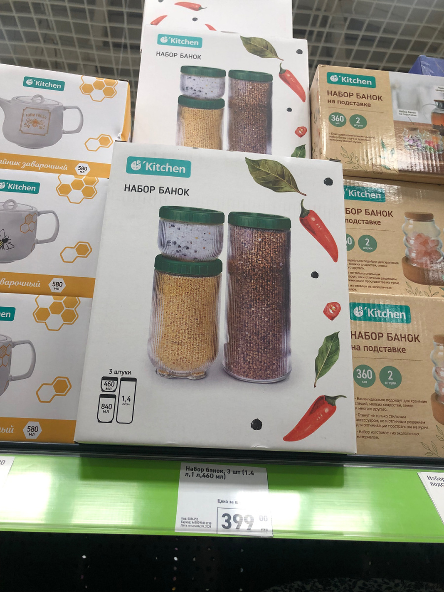 Понравились наборы банок для сыпучих продуктов. В наборе 3 баночки разного объема. Они с крышками. Объемы: 460 мл., 840 мл., 1,4 литра (высокая). В таких баночках можно хранить крупы, специи, макароны. Стоят не дорого, 399 рублей за набор.