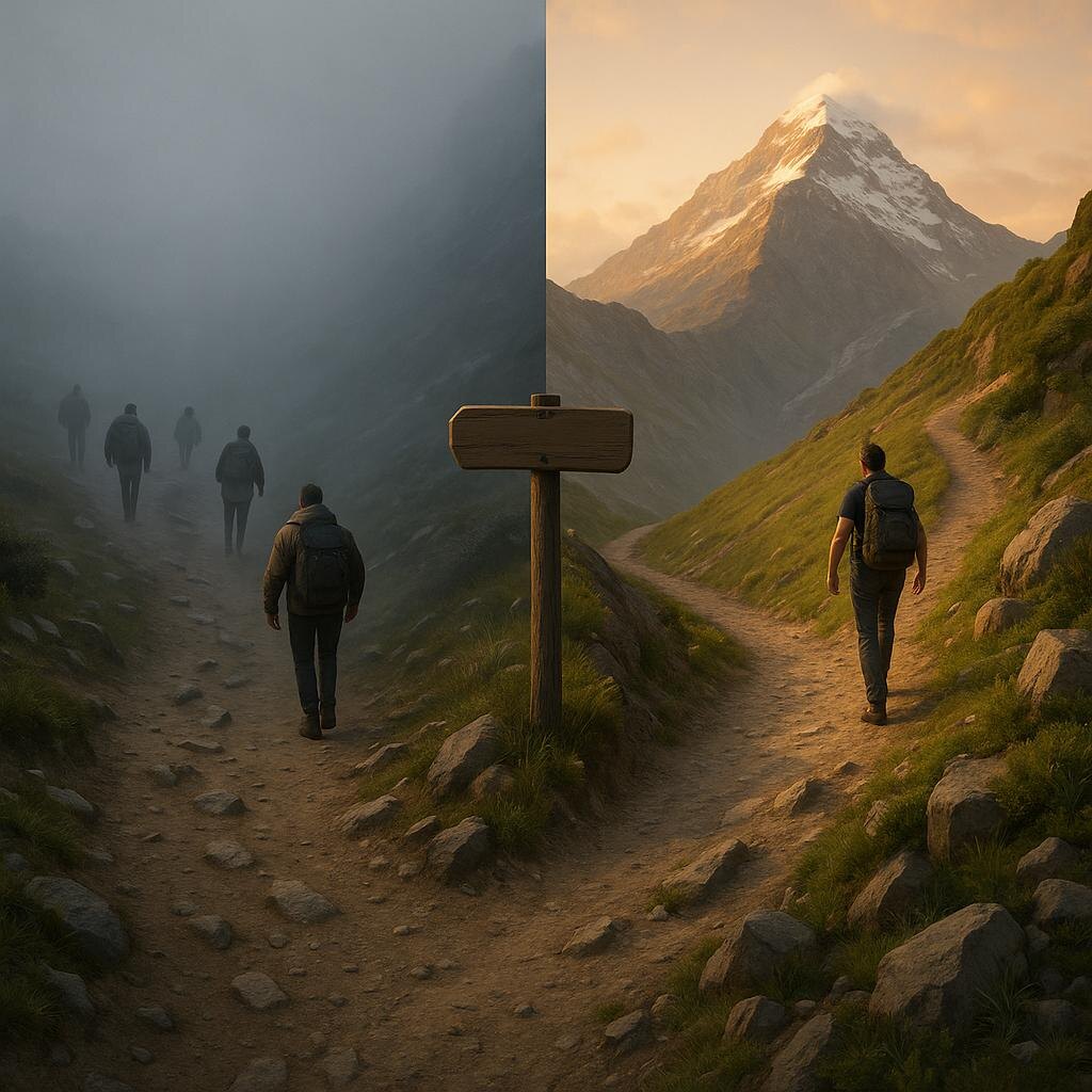 Почему многие сходят с тропы на полпути 😔 (Серия о восхождении к большим целям — пост 3 из 5) Знаешь, что удивляет больше всего в восхождении к цели? Не то, что люди боятся начать. А то, что бросают, когда самое сложное уже позади. 💭 Парадокс полпути: Первый шаг сделали — страх преодолён. Привычка сформирована — система работает. Результаты есть — прогресс виден. И вдруг... стоп. Человек сходит с тропы. 🤔 Почему так происходит? 1. "Долина разочарований" Начало — эйфория: "Ура, я начал!" Первые недели — восторг: "Работает!" Через месяц — привычка: "Нормально..." Через два — скука: "А где обещанные результаты?" Мозг привыкает к улучшениям и перестаёт их замечать. 2. Эффект "плато" Первые результаты приходят быстро. Дальше — медленнее. 108→100 кг — за месяц, заметно. 95→91 кг — за три месяца, еле видно. Но вторая часть часто важнее первой! 3. Потеря смысла "зачем" В начале ясно: "Хочу изменить жизнь!" На полпути: "А зачем мне это нужно?" Без ясного "зачем" — любая троп