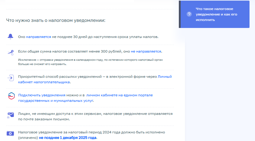 Вовсю идет информационная кампания по исполнению налоговых уведомлений по имущественным налогам, НДФЛ, не удержанным налоговым агентом и начисленному на доходы, полученные по процентам от вкладов за 2024 год. Разослать уведомления ФНС обещает до 20 октября. И сообщает, что разместила новую промостраницу по налоговым уведомлениям на 2025 год. Заходите и узнаете, когда и как уведомление оформляется, как оно направляется, как его исполнить: Есть там и пояснения по налогообложению имущества «физиков» в целом. В том числе ведомство рассказывает, что в налоговых уведомлениях в 2025 году изменилось по сравнению с 2024 годом (см. также письмо ФНС от 15.07.2025 № БС-4-21/6708@): Транспортный налог Земельный налог С информацией о кадастровой стоимости земельного участка можно ознакомиться, получив выписку из Единого государственного реестра недвижимости в МФЦ или на официальном сайте Росреестра. Налог на имущество физлиц С информацией о ставках и льготах можно ознакомиться в рубрике сайта ФНС «С