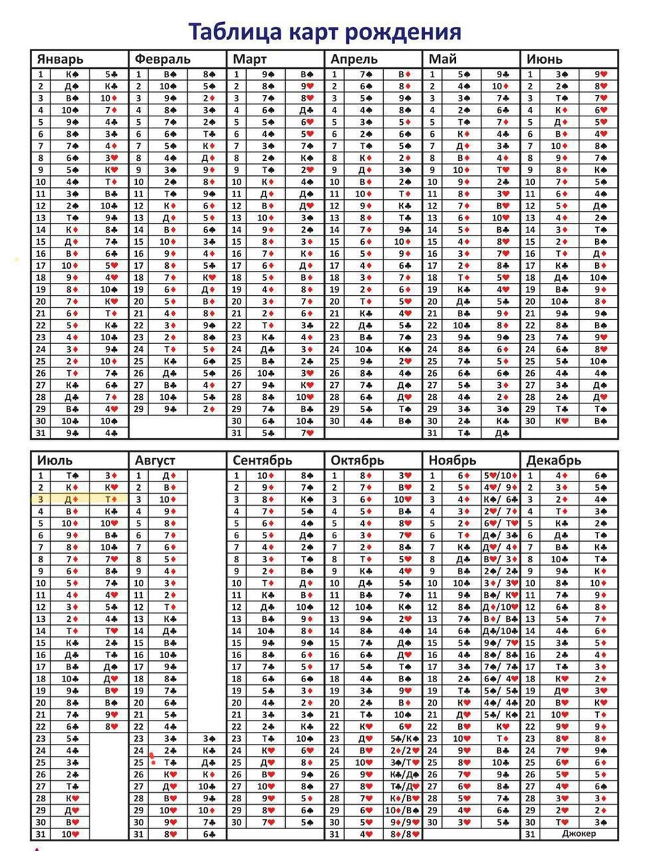 ▶️ 2 карты, которые управляют вашей жизнью ♥️ ♣️ ♦️ ♠️ Как определить свою карту рождения? Один из самых интересных и глубоких методов анализа личности по дате рождения — Матричная астрология, основанная на системе игральных карт и космических законах Вселенной. Этот инструмент пришел к нам из древних времен, сохранившись через традиции ордена Магов. 🔺 Как найти свою карту? ♥️Найдите в таблице свой месяц рождения. ♥️Затем — число рождения. Карты, соответствующие этой дате, и есть ваша энергия рождения по Матрице. Пример: Моя дата рождения — 03.07.1969. → Ищем июль, затем 3-е число. Мои карты рождения: Д♦️ Т♦️ (см. таблицу, выделено желтым). 📌 Что означают карты? - Первая карта (70% влияния) — ваша основная энергия, задача этого воплощения. - Вторая карта — ваш "аварийный режим", активируется в кризисах. 🔴 Особые случаи: - Август — одна карта (вся жизнь фокусируется на ней). - Ноябрь — три карты (третья — "усилитель", включается в судьбоносные моменты, резко меняя событи