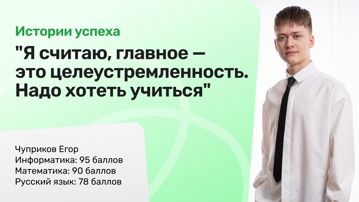Егор Чуприков занимался в ЕГЭбурге с 8 класса. Подтянув знания и сдав экзамены, возвращался к нам уже на следующее направление. Так что мы по праву считаем его своим выпускником и гордимся! Егор, почему вы выбрали именно ЕГЭбург для подготовки? Это уже традиция. Я с восьмого класса занимаюсь в ЕГЭбурге. Сначала мне нужно было подтянуть физику в школе, потом готовился к ОГЭ, и вот сейчас к ЕГЭ. А кто из преподавателей вам запомнился больше всех? Думаю, это мой учитель по информатике, Иван Владимирович Бачанцев. Он всегда хорошо преподавал материал, и на занятиях было весело. Я ходил на них с удовольствием! И в целом мне информатика очень нравится. Скажите, а есть ли у вас рецепт для наших будущих учеников, как добиться такого же успеха, как вы? Я считаю, главное — это целеустремленность. Надо хотеть учиться. И еще нужно немного везения. И чуть-чуть таланта. Вы ходили к нам на три предмета. Проводили в ЕГЭбурге так много времени, что буквально у нас жили целый год. Приходилось ли вам чем