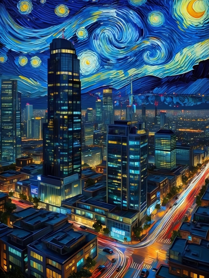 «Futuristic cityscape in the style of Vincent van Gogh, night scene, swirling skies, expressive brush strokes, vibrant colors»